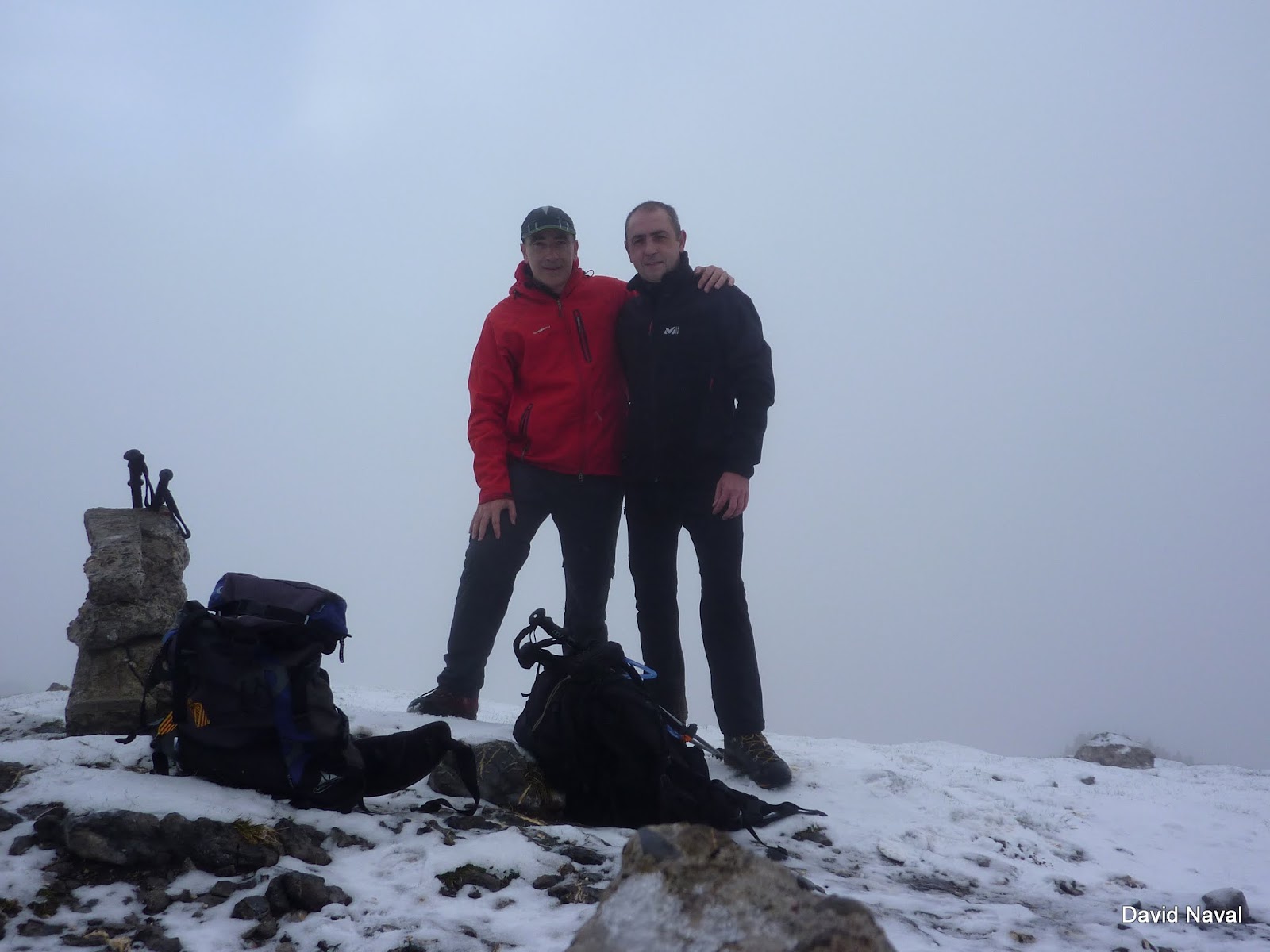 Desde el collado giramos a la derecha y en unos quince minutos hacemos cima en el Pacino (1.965 m.). Las nubes nos envuelven y hace bastante frío. Encontramos una fina capa de nieve en los metros finales.
