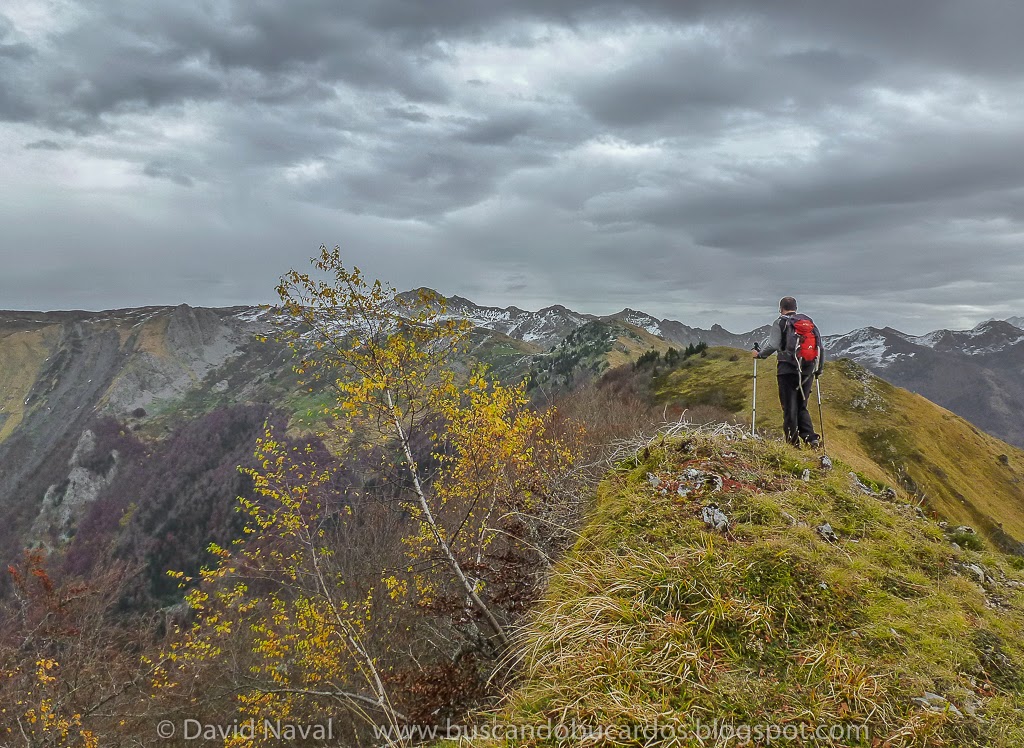 A partir de este punto recorreremos hacia el Este un largo cordal, de unos cuatro kilómetros de longitud. Caminaremos con calma, disfrutando de fantásticas vistas del profundo y frondoso Valle de Gey por nuestra izquierda y los bosques caducifolios del Valle de Aydius por la derecha, que todavía presentan un aspecto otoñal.