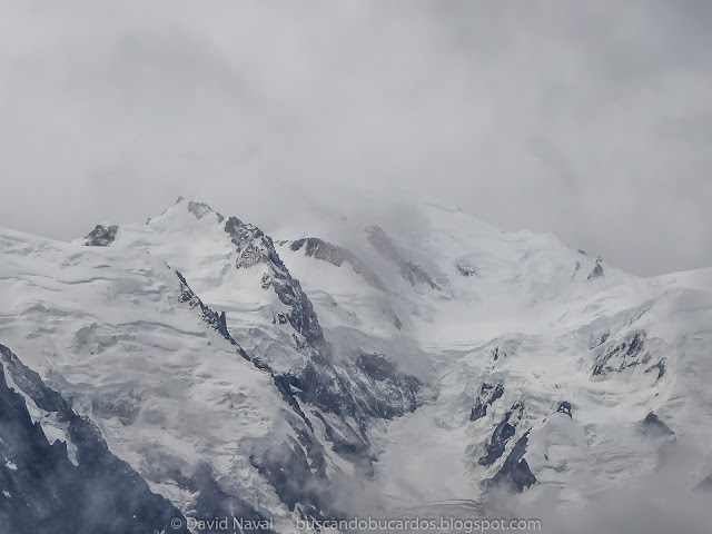 Hoy es día de caminar con chubasquero. El Macizo de Mont Blanc sigue impresionando semioculto entre nubes bajas