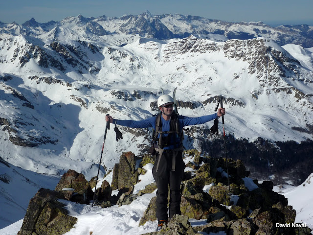 Llegamos al Col de L’Iou (2.192 m.) y nos calzamos los crampones pues hay que remontar dos empinadas y largas palas para alcanzar la cumbre. Por su orientación suroeste la nieve todavía está un poco dura en algunos tramos aunque ya le da el sol y se va reblandeciendo. Cargamos los esquís en la mochila y subimos paso a paso, sin prisa, hasta la cima. En la cumbre hay bastante gente. Vemos subir montañeros por las diferentes rutas de ascenso.